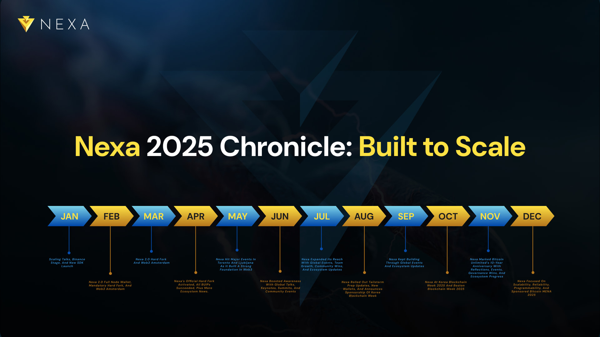 Conference sponsorships continued, several BUIPs passed successfully, and major wallet updates rolled out (Otoplo 5.0.0). Educational resources expanded with new guides and the two-part article series “What Can You Build on Nexa?”