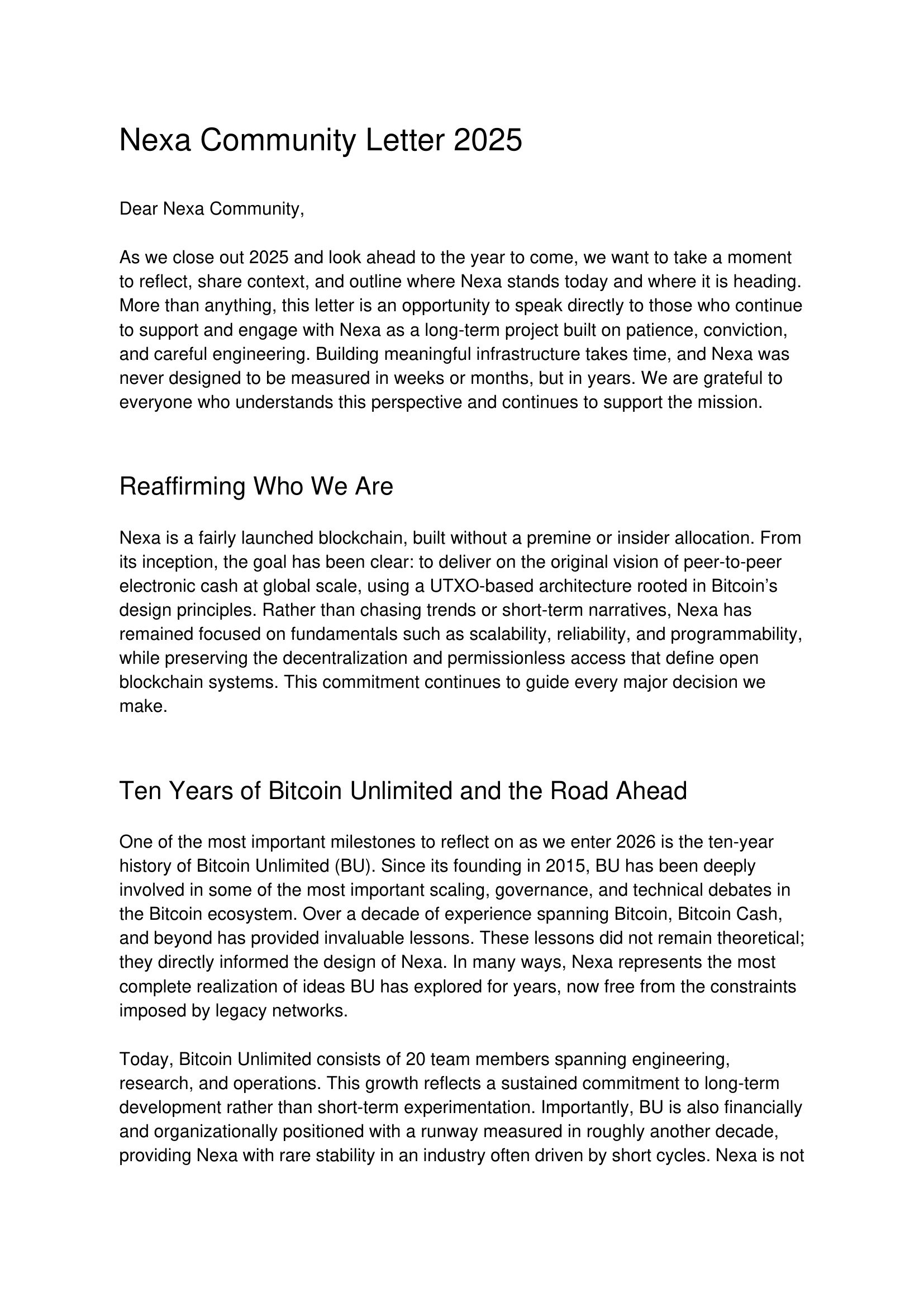 As we close out 2025 and look ahead to the year to come, we want to take a moment to reflect, share context, and outline where Nexa stands today and where it is heading. More than anything, this letter is an opportunity to speak directly to those who continue to support and engage with Nexa as a long-term project built on patience, conviction, and careful engineering. Building meaningful infrastructure takes time, and Nexa was never designed to be measured in weeks or months, but in years. We are grateful to everyone who understands this perspective and continues to support the mission.